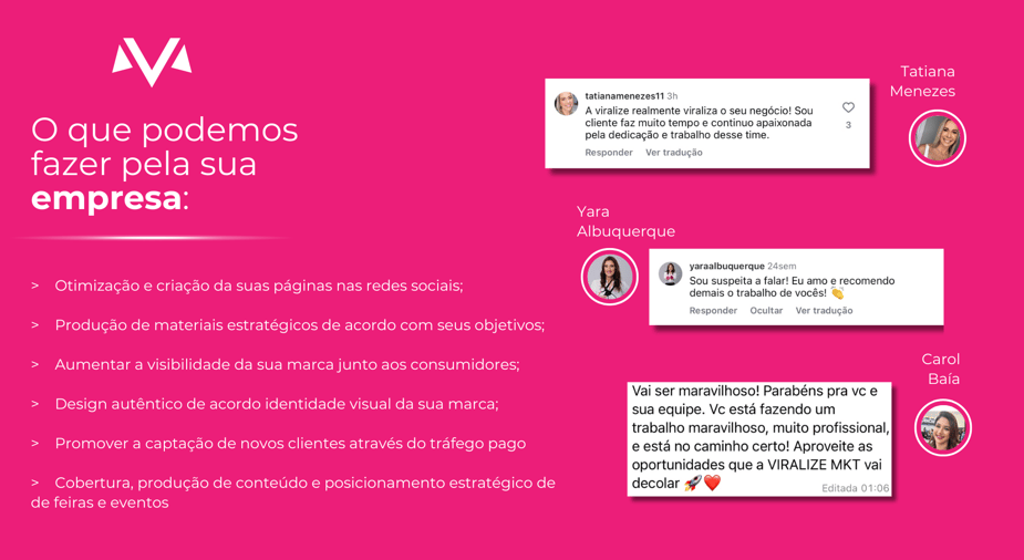 A equipe da Viralize é extremamente profissional e dedicada. Eles entenderam nossas necessidades e entregaram resultados que realmente impactaram nosso negócio. Recomendo a todos!